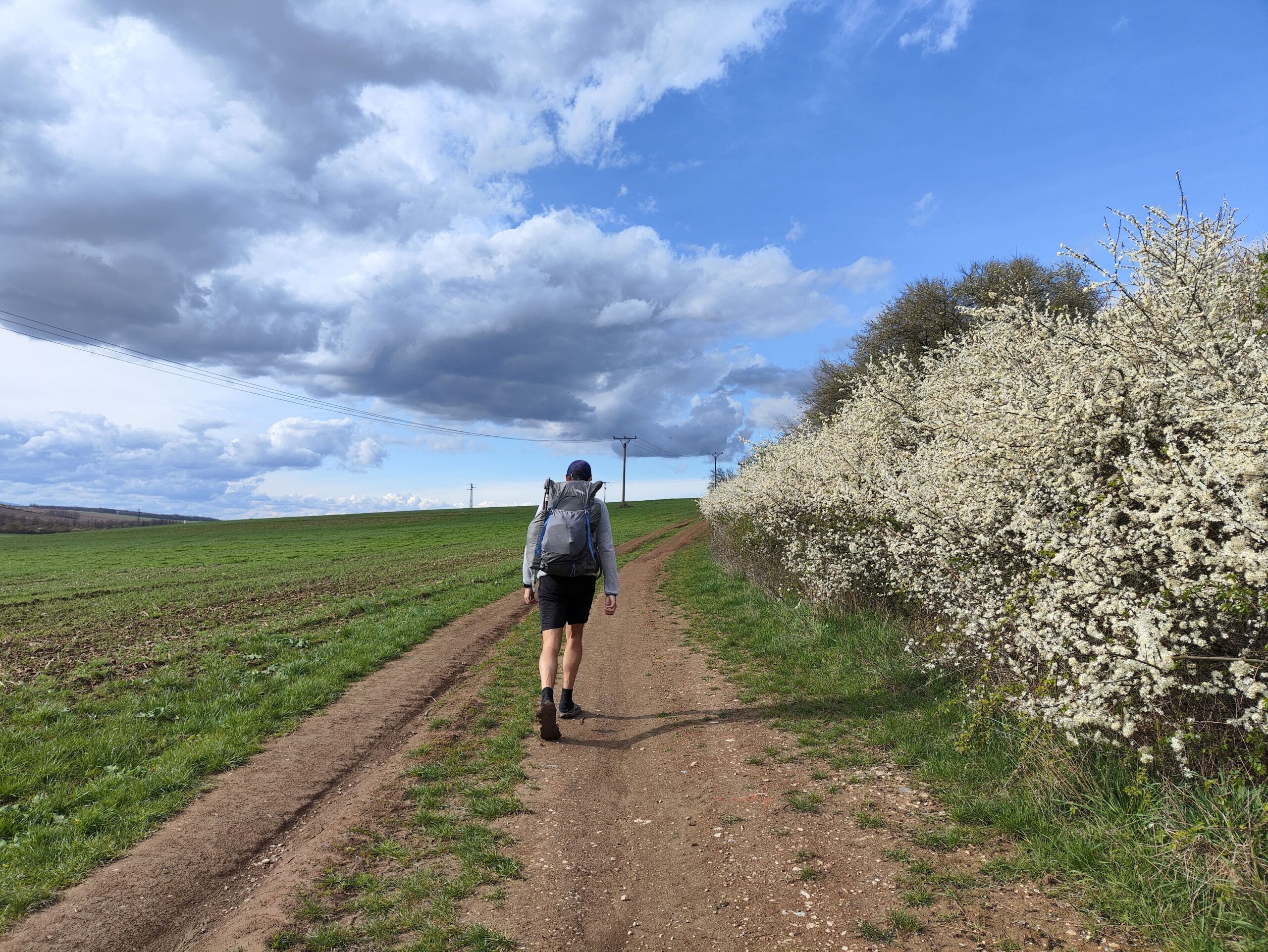 Prvá zastávka je na Sládkovičovej, u Jozefových rodičov, na syrové pagáče do cesty. A ešte kávu, na tú som úplne zabudla. Je to celkom vtipné ako divne po nás ľudia pozerajú, že kde sme sa vybrali s takými batohmi. Z Partizánskeho ideme po poľnej ceste popri voňavých rozkvitnutých kríkoch.