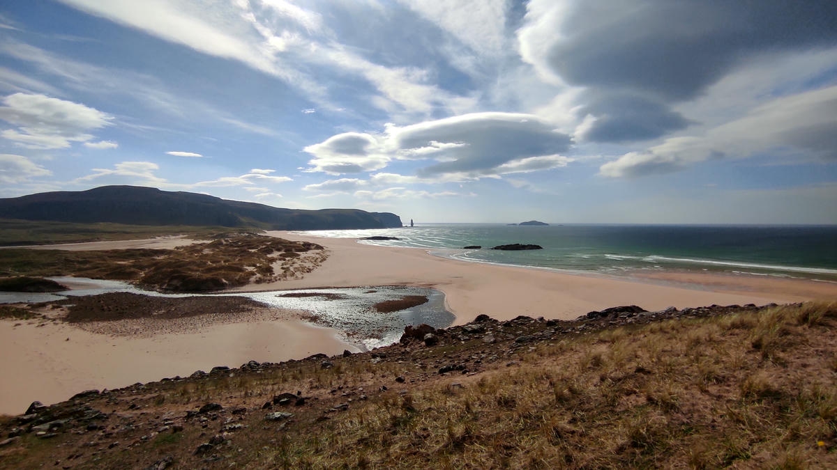 Pokračujem okolo Loch Stack smerom na severovýchod, proti vetru. Točím sa na severozápad popri Loch a’Gharbh-bhald Mòr a vietor fúka do chrbta. Okolo ôsmej sa mi zdá, že prestalo trochu fúkať, tak si sadám k raňajkám na brehu jazera. Po asi 3 hodinách prichádzam do dedinky Rhiconich, odtiaľ to je 6 km po asfaltke do Kinlochbervie. Toto je taká nezáživná pasáž, len ma obiehajú autá. V Kinlochbervie idem do obchodu po pivo (Orkeny IPA) a nejaké dobroty na posledný večer. Zastavujem aj v kaviarni Worth the Look (spoiler: It’s not worth it) a dávam si anglické raňajky a čierny čaj.
