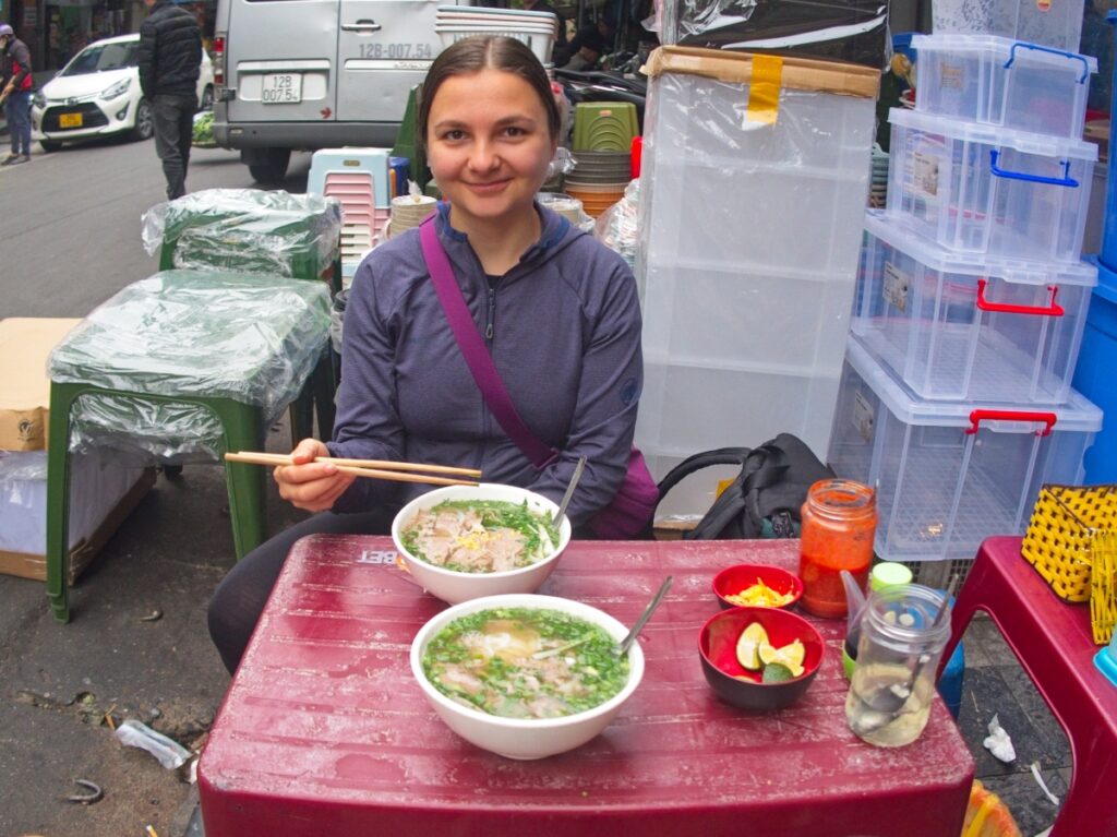 Hanoi teda určite nie je tiché mesto. Ešteže som si zobrala štuple do uší. Skoro ráno nás budia tety, ktoré už chystajú jedlo na celý deň. Vstávame o 8, rýchlo všetko pobalíme a ideme smer tržnica. Po ceste sa zatavíme na kávu u dákeho pána. Vypýtali sme bez cukru a bez mlieka, ale aj tak je sladená. Chvíľu posedíme na mini stoličkách a ideme ďalej. Na tržnici kupujeme dózičku a nožík. Jozef je oproti všetkým o tri hlavy vyšší. Pri tržnici si nájdeme podnik na raňajky. Dávame si pho bo polievočku.