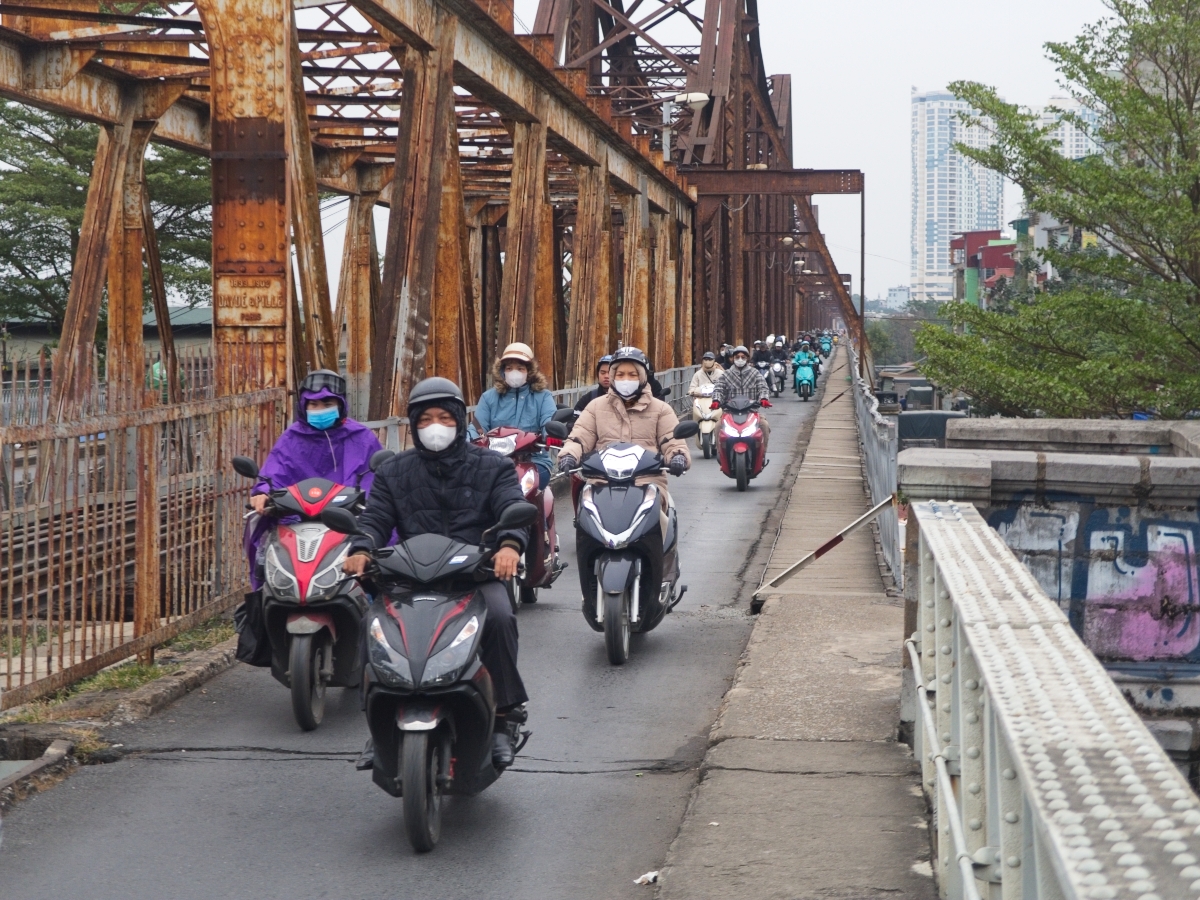 Snažíme sa nájsť Agribank bankomat, ktorý má najmenšie poplatky, ale nie a nie ho nájsť. Keď už sme to vzdali a išli vybrať z náhodného bankomatu, tak sme ho zbadali hneď vedľa. Vyberáme 3 milióny dongov, čo je skoro 120 €. Dnes sa chceme presunúť na ostrov Cat Ba. Zistili sme si, že autobus do mesta Hai Phong ide zo stanice Gia Lam, čo je ešte asi 3 km. Ideme cez 1,7 km dlhý, železničný most cez Červenú rieku. No a nie je to moc príjemné. V strede je železnica, potom po oboch stranách cestičky pre motorky a pri zábradlí veľmi úzky chodník z železobetonových hranolov, ktoré nevyzerajú veľmi dôveryhodne.