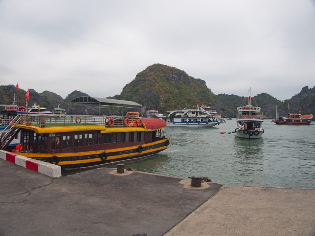 Nalodíme sa a ideme na druhé poschodie na výhľad. Je mi dosť zima, lebo to je celé otvorené. Jozef mi doma vravel, že vraj vo Vietname bude teplo a že stále nosil kraťasy, ale tie má aj teraz. Za polhodinku sme na ostrove a rýchlo fičíme do mestečka Cat Ba, konkrétne do prístavu. Chceme si zajednať plavbu na zajtra. Hneď ako zastavíme, tak nás odchytí pani, ktorá ponúka plavbu za milión dvesto tisíc, to sa nám zdá teda veľa. Ideme teda hľadať ďalej. Mysleli sme, že tu bude veľa ľudí ponúkať plavbu, ale nikto nikde. Nakoniec nás osloví jeden pán, ktorý tam má turistickú agentúru a zajednávame plavbu za 590 000 dongov na osobu. V cene je celodenná plavba, obed, kajak, nejaké plávanie a Monkey island.