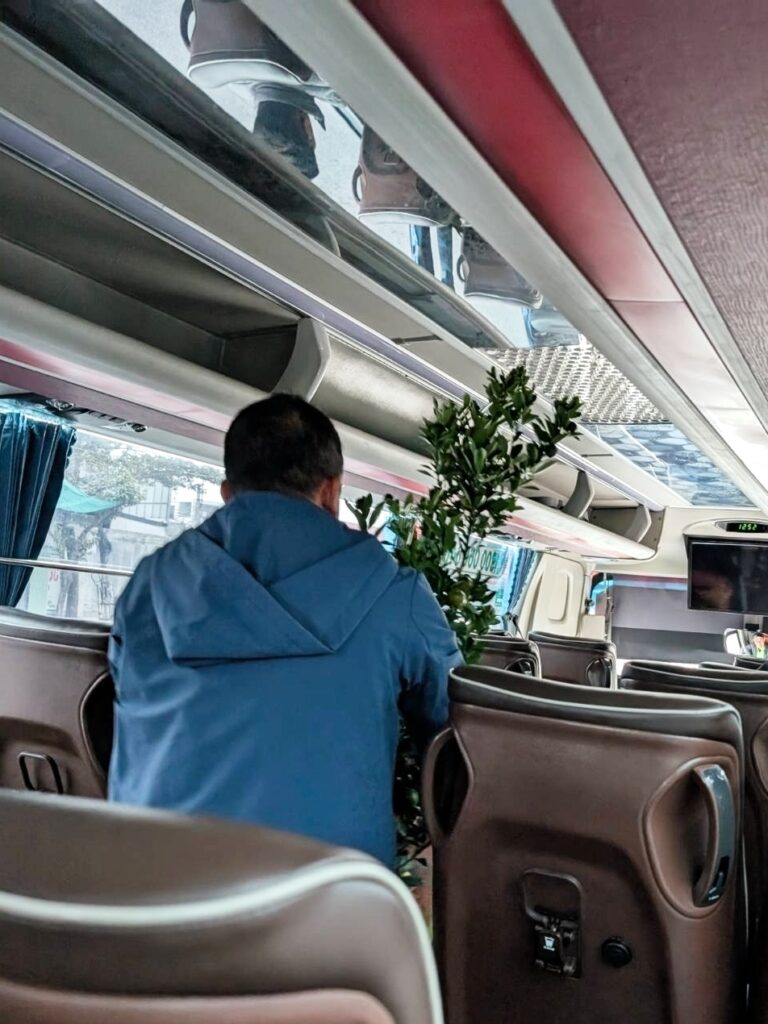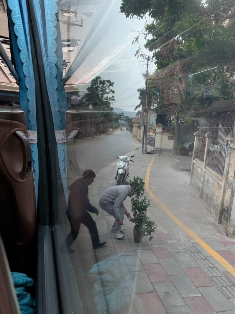 Ale pravdepodobnosť, že by sa to prelomilo je dosť malá. Kráčame už neturistickými uličkami Hanoja. Sú tu také špičkové holičstvá na ulici, ale ešte je skoro. Prídeme na stanicu a pýtame sa paní u okníčka, kedy ide autobus do Hai Phong. Odporúči nás na stánok hneď pri vchode. Kupujeme lístky za 120 000 na osobu a za 10 minút nám to ide. Autobus má pekné kožené sedačky, ale výškou je uspôsobený pre Vietnamcov. Autobusy fungujú aj ako kuriér. Stačí zamávať na autobus a ten dopraví balík na nejaké odberné miesto, kde si to už druhá strana môže vyzdvihnúť. Jeden muž posielal metrový limetkovník, tak ten dali na sedačky, nie do úložného priestoru.