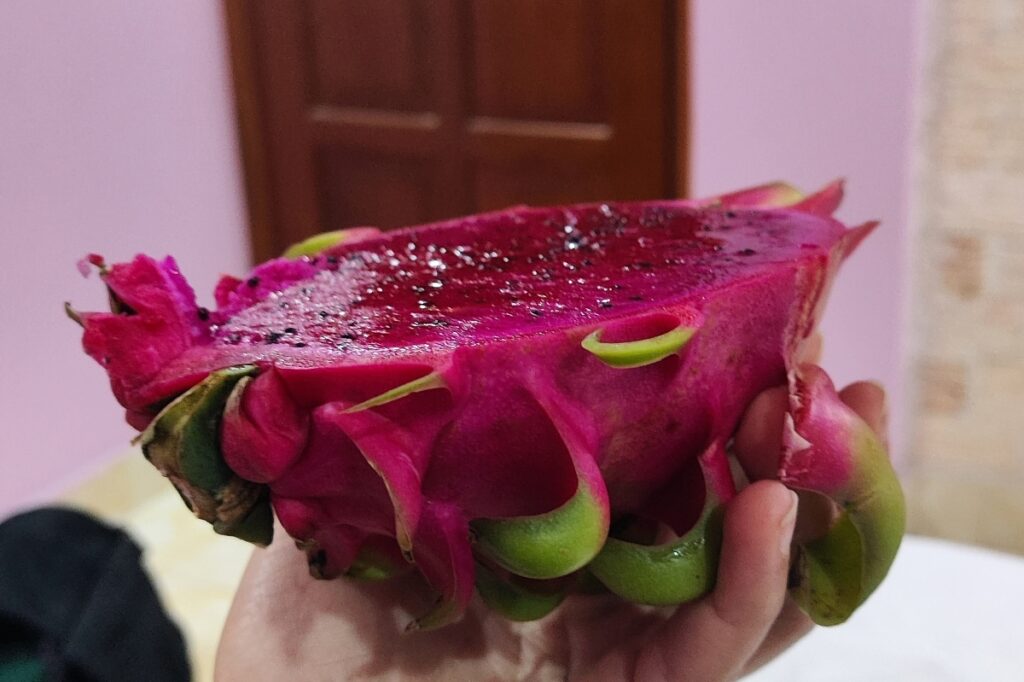 Potom sa konečene poberieme na hotel do mesta. Je strašne lacný, ale s dobrými recenziami. Privíta nás taká milá Vietnamka. Izba má dve okná, ale je tam asi 10 cm miesta k ďalšej budove a walk-in sprchu. Zložíme veci a ideme sa najesť. Centrum mesta je celkom dosť turistické. Jozef je zdesený z toho ako sa to tu pomenilo. Všade sa stavia. Tam kde bola pláž je teraz asi 30 strojov, ktoré idú stavať nejaký megalomanský projekt. Ideme smerom odkiaľ sme prišli, lebo tam boli reštaurácie, ktoré sa nám páčia. Zrazu ich ale nevieme nájsť a keď už sa niekde zastavíme, tak tam ponúkajú dáke divné jedlá. A to mi Jozef vravel, že tu nebudeme musieť hľadať reštaurácie. Už som fakt hladná, a teda nervózna, ale nakoniec konečne sadneme do takej, kde čapujú aj pivo. Objednáme si hovädzie nudle a pani nám to pripravuje pri nás, vonku. Za pár minút máme jedlo na stole, tak už som spokojnejšia. Po ceste naspäť sa ešte obzeráme po nejakej bagetke, ale nič sme nenašli, tak si ideme kúpiť ovocie na tržnicu. Kupujeme mango, banány a dragonfruit.