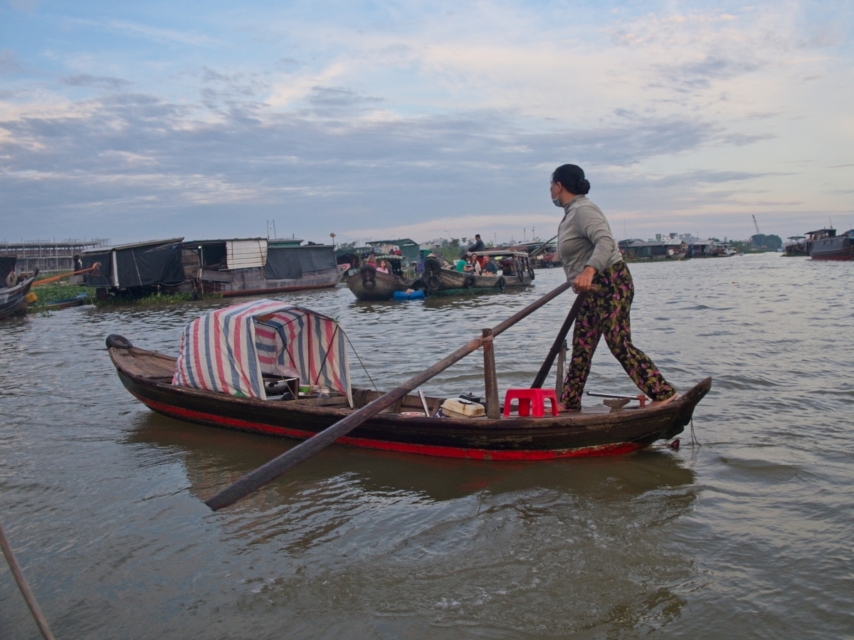 Na 6 ráno máme zajednanú loďku na plávajúce trhy. Vstávame 5:20 a o 5:40 odchádzame. Nenapadlo nám večer povedať majiteľovi, že budeme skoro ráno odchádzať, takže je zamknuté. Býva na prízemí a mu klopeme na dvere. Vyzerá, že už nespal. Otvára tri brány, čo sa nám zdá trochu pehnané. Vonku to už poriadne žije. Na námestí sa chystajú skupinové cvičenia. Každá skupina má vlastné tričká a už sa pomaly rozcvičujú. Prídeme ku trajektu a čaká nás tam už pani. Nasadneme do loďky zaplatíme a ideme.