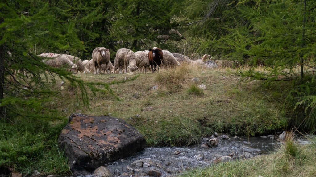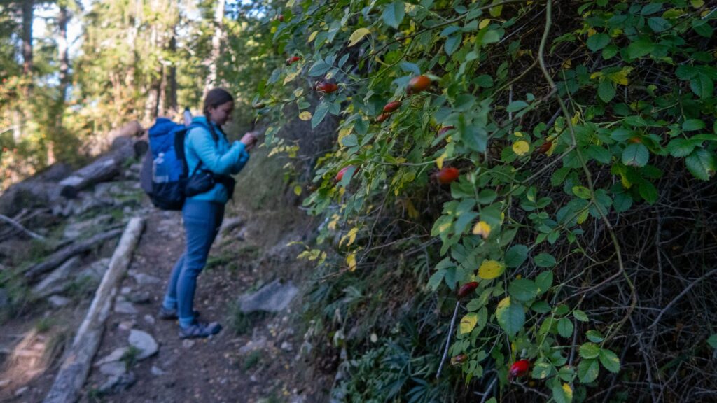 Jozef vraví, že to tu vyzerá ako v Kršteňanoch na lúke, len s parádnymi horami naokolo. Na každom kroku sú šípky, rakytník a drač. Chodník stúpa celkom príjemným sklonom cez lúky a lesy. Narazíme na stado oviec a bojíme sa prejsť, aby nás nejaký havko nedokusal, ale oproti si vykračuje nejaká pani, tak ideme aj my. Predbehneme ovce a dávame si dlhšiu prestávku na bagetu a filtrovanie vody. Jozef chystá bagety, ja filtrujem. Ako náhle dofiltrujem, tak sa nám za chrbtom zrazu objavia ovce a my musíme rýchlo baliť a ísť ďalej. Postupujeme s bagetou v ruke, aspoň sme sa nezasedeli. Prejdeme malý mostík a na chvíľu si sadnem, že si dojem tú bagetu, len tie ovce nás furt prenasledujú, tak ideme ďalej, prestávka nebude.