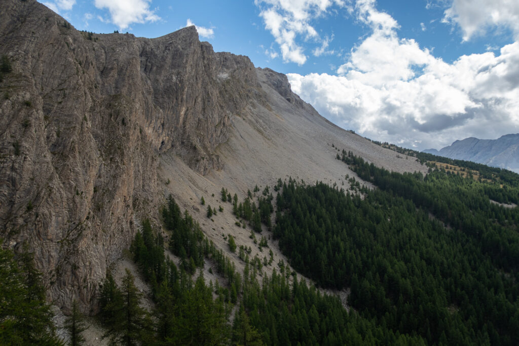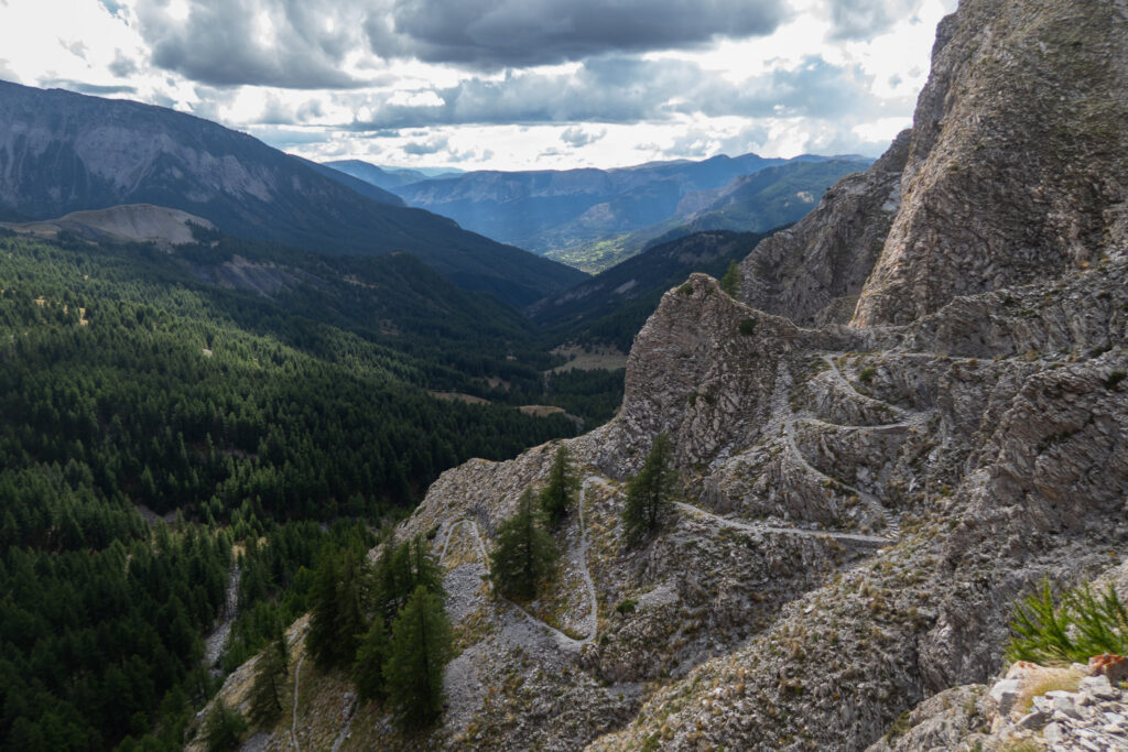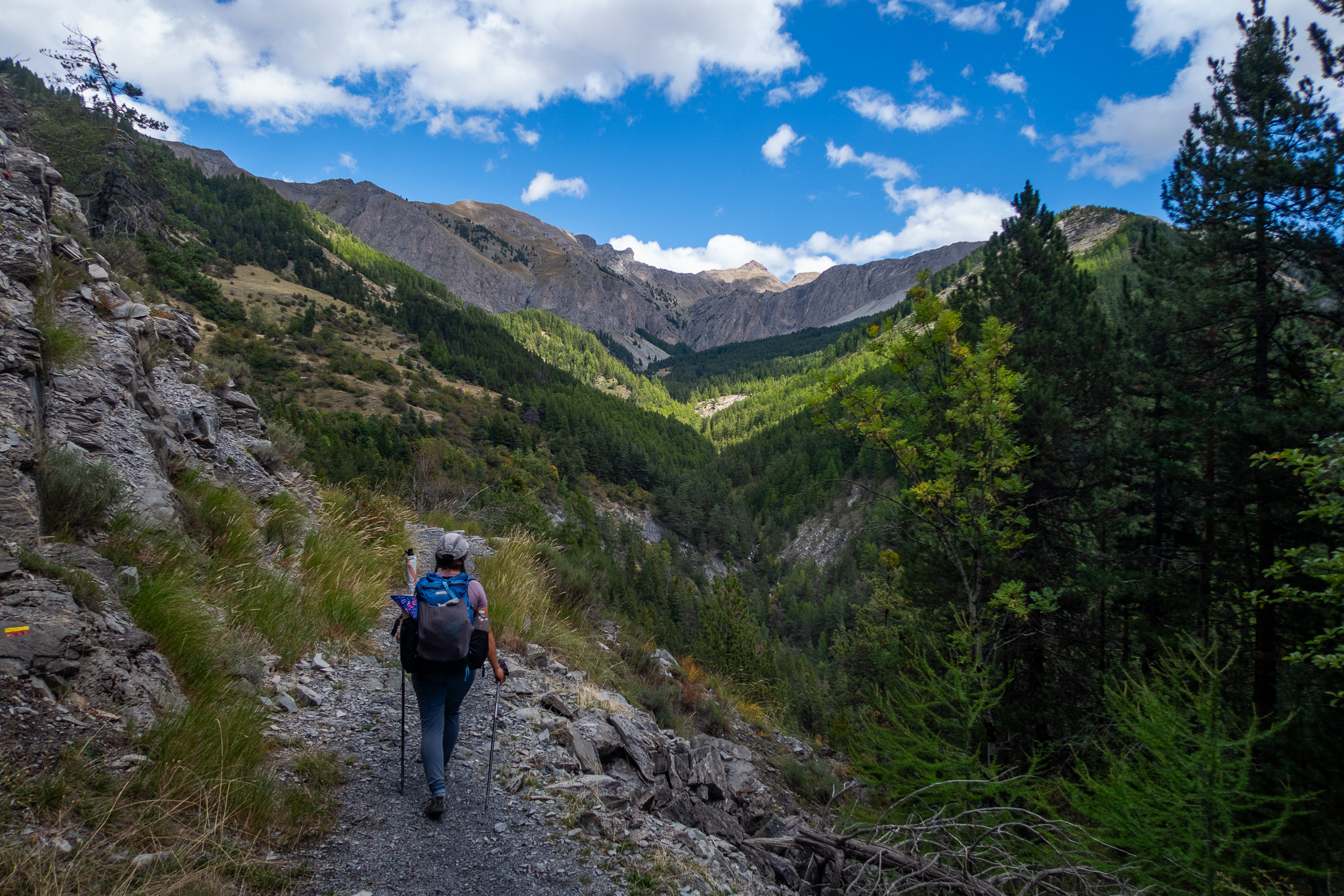 Po 5 km zastavujeme na skale s výhľadom. Rozkladáme vlhké veci, jeme bagetu a croissant, a chytáme veľmi chabý signál na vybavenie nejakých vecí. Posedíme takmer hodinu, pobalíme veci a vydávame sa ďalej. Po chvíli stretáme dvoch cyklistov s pohorkami na nohách, nechápem. Máme výhľad na mesto Colmars, tak chytáme ešte lepší signál na chvíľu. Okolo prefrčia ďalší cyklisti, tentokrát na elektrobicykloch. Napojíme sa na asfaltovú cestu a kúsok po nej klesáme. Gps nám ukazuje ísť do nejakej zeliny, ale moc sa nám to nezdá. Prejdeme to nejako cez les na cyklotrasu a potom ako takým chodníkom až po takú chajdu, kde mala tiecť voda, ale netečie. No nevadí, nafiltrujeme niekde ďalej z potoka. Cikcakom klesáme 200 výškových metrov k rieke. Prejdeme cez kývajúci sa most a opäť stúpame. Sme v 1500 m.n.m., tak je tu aj celkom teplo, vyzliekam sa do trička. Dávame chvíľku prestávku na oriešky a čokoládu. Už tu je cítiť začínajúca jeseň.