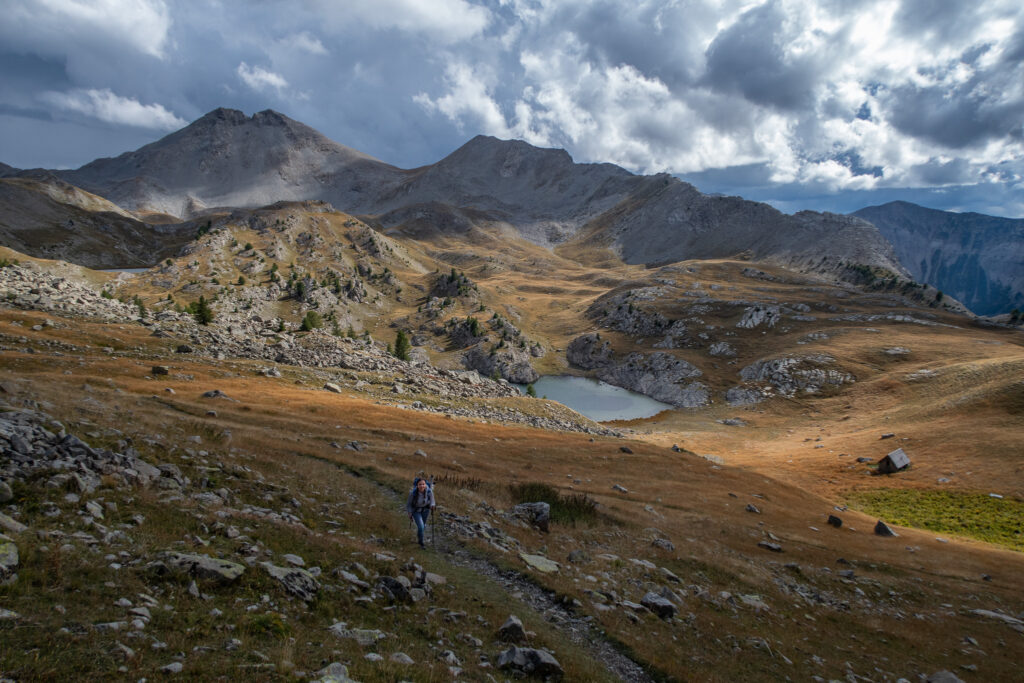 Prehupneme sa cez skalný výbežok a pokračujeme miernym chodníčkom. Začínajú sa objavovať svište a kamzíky. Prejdeme cez také malé sedlo a otvorí sa nám nová krajina. Sú tu jazierka a jesenne sfarbená tráva. Chceli sme si dať ešte prestávku, ale rýchlo pokračujeme do sedla Col de l’Encombrette (2527 m.n.m.) , lebo sa nám nejako začína zmrákať nad okolitými horami.