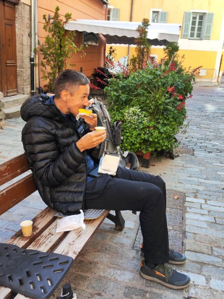 Obom sa naše rozhodnutie ísť na juh nepozdáva. Ideme sa teda spýtať do turistickej informačnej kancelárie aké sú podmienky na horách. Pani hovorí veľmi lámavou angličtinou, ale na mape nám ukáže, že na sever od Isoly 2000, kam by naša cesta teraz mala pokračovať, snežilo len málo a je tam iba taký poprašok, ale poriadna zima. Ešte nám ukazuje trasy a oblasti, ktoré sú pekné. Tak je teda rozhodnuté, ideme ešte pokračovať v pôvodnom pláne, keby niečo, tak sa dá jednoducho zmeniť. Ideme teda nakúpiť zásoby na tri dni, mačka už v obchode nie je a my tam nechávame 50€. Kupujeme radšej viac, lebo nám to ledva vyšlo predchádzajúci úsek. Potom ideme opäť do pekárne dokúpiť ešte dve bagety. Zastavíme sa aj v obchode so suvenírmi či náhodou nemajú kartušu. Majú, ale len napichovaciu. Paní sú ale veľmi nápomocné a zavolajú chlapíkovi, ktorý má, ale že doma bude až 12:15. Ideme si teda posedieť na lavičku. Slniečko hreje a je úplne príjemne. Máme veľa času, tak ideme ešte na kávu.Využívame tohoto času v civilizácii a dávam si wafľu a Jozef hotdog. O 12:05 idem na miesto, ktoré mi ukázali na mape. Vyzerá to tam tak opustene a mám pochyby či je to správne miesto. Počkám 10 minút a idem sa znova spýtať či mi dali dobrú adresu. Obchod je už ale zatvorený, tak idem späť a spýtam sa takej ženy. Ukazuje mi na dom kúsok vedľa a naozaj je tam dvor plný plynových bômb. Prídem tam a nikde nikto, zvoním a nič. Skúšam teda telefónne číslo. Zdvihne mi to pán, ale absolútne nevie nejakým iným jazykom a furt mi tam čosi hovorí. V pozadí počujem niečo o Slovensku. Zložím a mám rozpísanú sms. Zrazu sa objaví ujo, ktorý okolo mňa prechádzal, keď som čakala pri tom druhom dome. Najprv mi donesie veľkú 500g, tak pýtam menšiu. Donesie mi 230g a vypýta si za to 16€, uf, to je celkom slušná prirážka. Nič s tým ale nenarobím, ja ju potrebujem a nikto iný ju v tomto meste nepredáva. Možno by sme vyšli aj s jednou kartušou, ale museli by sme veľmi šetriť a v tejto zime si radšej ohrievam aj vodu na pitie, lebo tej ľadovej dám tri glgy a viac sa nedá. Idem späť za Jozefom, zaplatíme a poberieme sa na kraj mesta stopovať. Stojíme 10 minút a žiadne auto, holt je obed. Po dobrej hodine a asi 10 autách nám zastaví riadne štýlová dodávka. Idú do Saint Dalmas, tam kde sme včera skončili. Super, tak sa aspoň napojíme aj na trasu a nebude nám chýbať žiadny kúsok. Asfaltová cesta totižto pokračovala vysoko do sedla a keby sme stopli auto, ktoré ide tam, ušetrili by sme 1200 výškových metrov. Posadia nás dozadu na posteľ. Vidíme, že tam majú nejaké košíky. Keď vystúpime, tak sa ich pýtam kam idú, že na huby. To sú naši ľudia. Ešte nás upozornia na chladné noci, ale vravím im, že už tri dni kráčame, že vieme, že je zima. Sú dve hodiny a my začíname poriadne prudký výstup. Je štvrtý deň a aj napriek tomu, že mám o dosť ľahší batoh od Jozefa, tak celkom výrazne zaostávam.