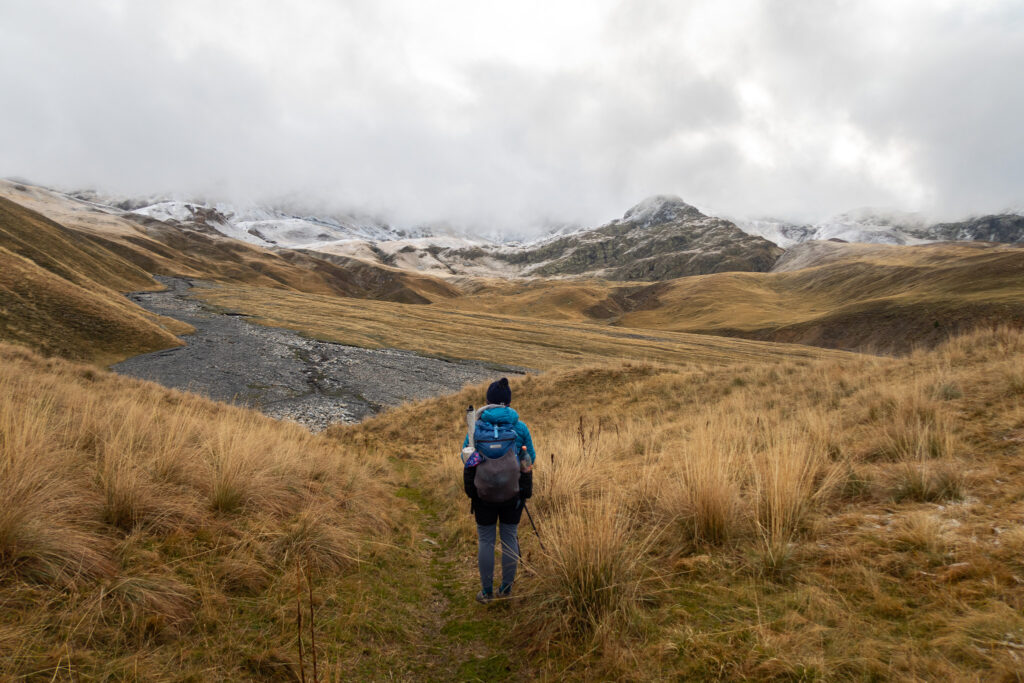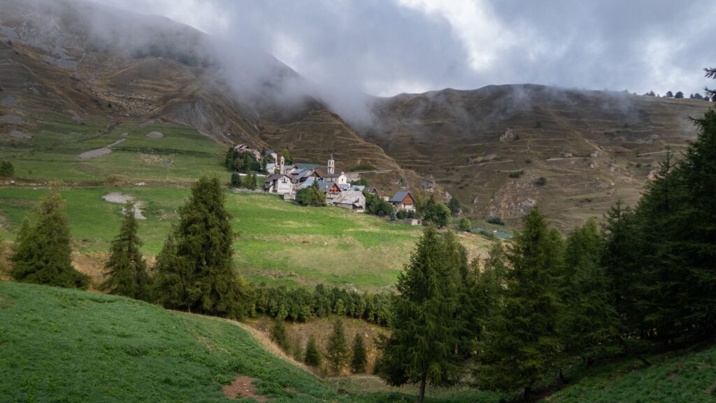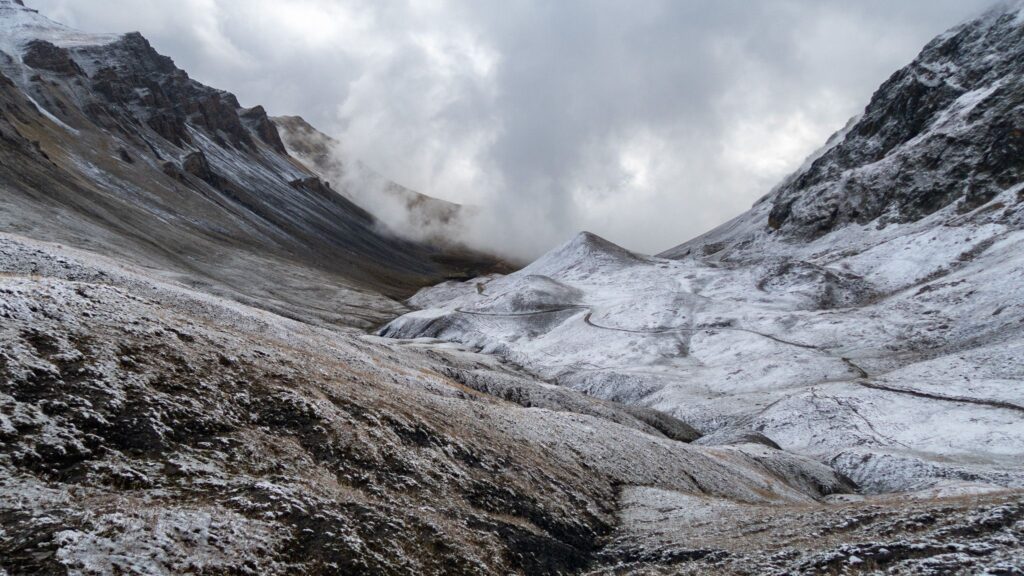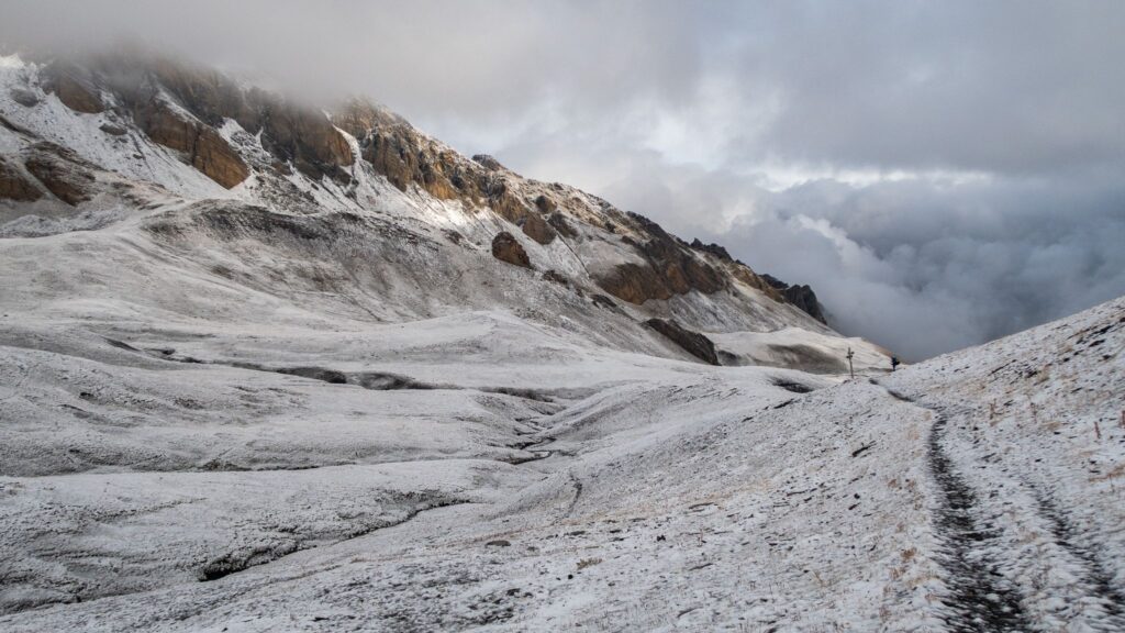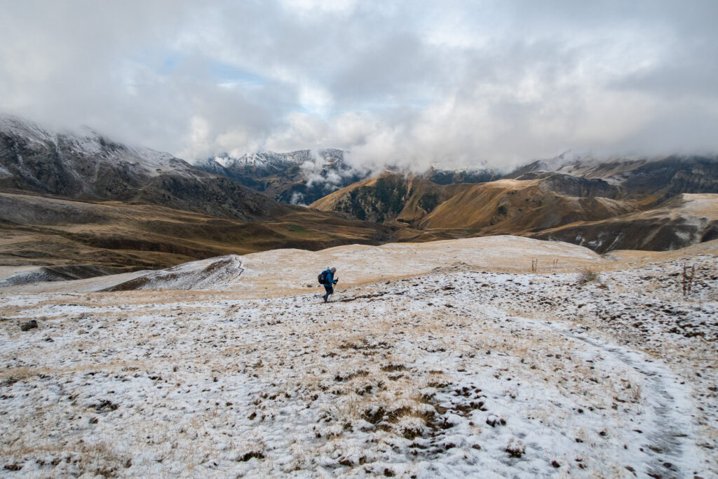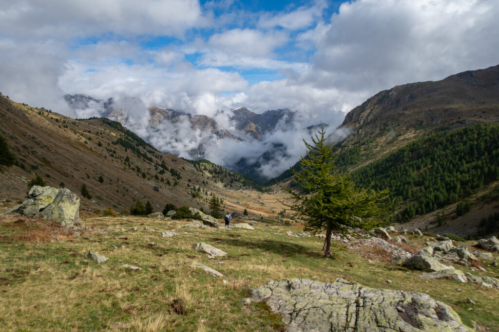 V sedle sa nám otvoria výhľady na zasneženú talianskú stranu. Pomedzi mraky občas zasvieti slnko, čo vytvára magiskú atmosféru. Pretraverzujeme kúsok do sedla Bassa di Colombart (2461 m.n.m.), kde zazvoníme na zvončeku a poberieme sa na zostup do usadlosti Ferrere.