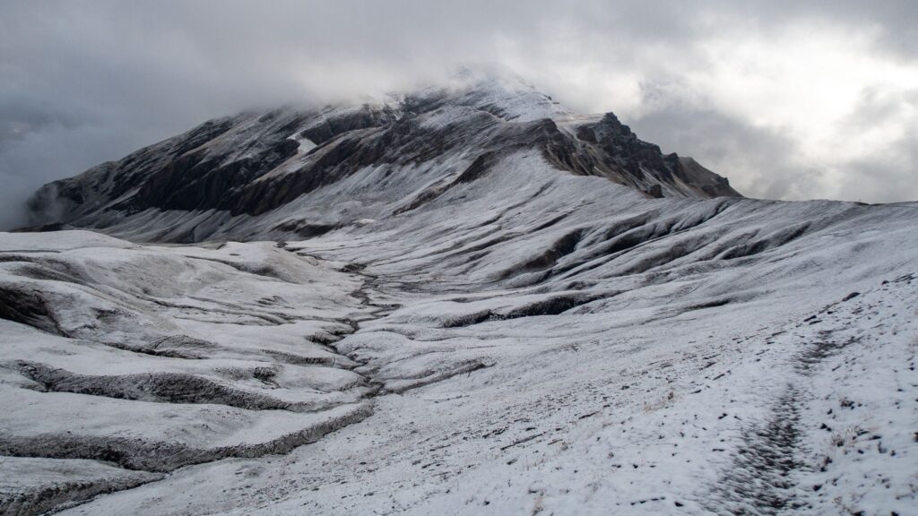 Má to tu taký islandský vibe, aj ten sneh hore. Od 2300 m.n.m. kráčame po kruste snehu. To sme teda nečakali, že na tomto výlete si budeme takto po snehu chodiť.