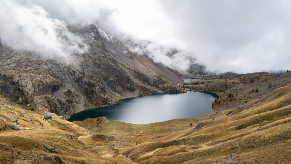 Prechádzame okolo pastierskeho domčeka, ale už je aj s ovečkami preč. Dávame si prestávku na obed, bagetu so syrokrémom. Stúpame ďalej a počasie sa zhoršuje, fúka a trochu sneží. Sme v sedle, späť vo Francúzsku. Traverzujeme do ďalšieho sedla a potom klesáme ku refugio de Vens nad jazerami Lacs de Vens.