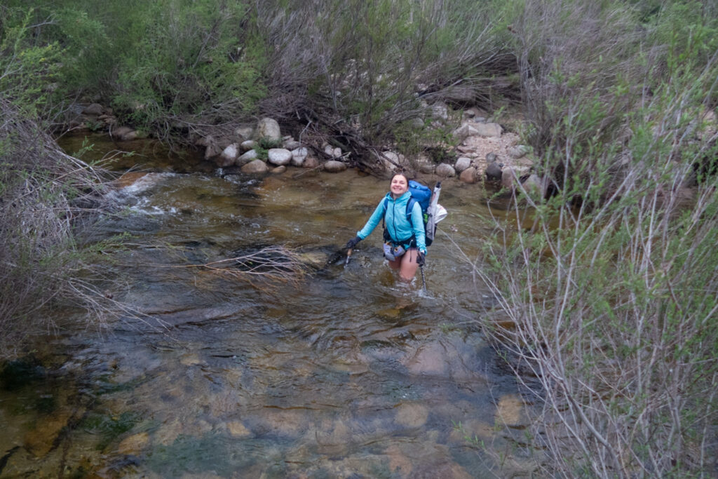 Zarasteným a mokrým chodníčkom smerujeme na miesto brodu. Vyzliekam nohavice a vyzúvam topánky. Vyzerá to byť dosť hlboké. Zisťujeme, že brod je ešte kúsok vyššie, tak tam naboso prejdem po kameňoch. Jozef ide prvý, aby vedel zhodnotiť výšku hladiny. Normálne asi taká vysoká nie je, ale je veľmi vlhká jar na Sardínii a včera aj pršalo. Vo vode sú pohazdane kamene, tak idem po nich a voda mi siaha do polky stehien.