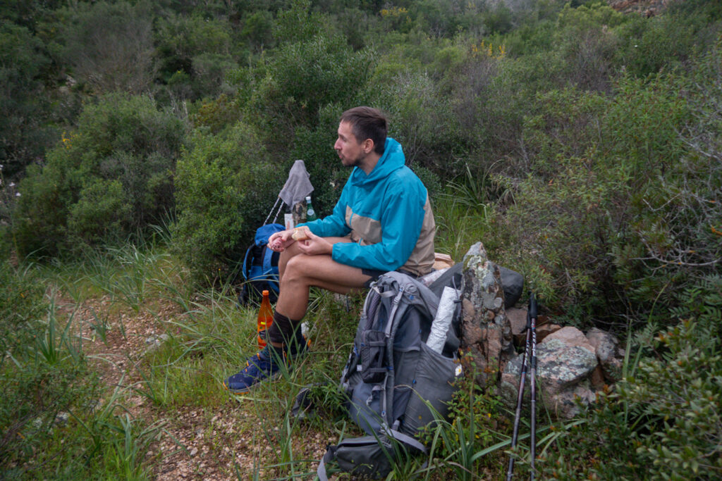 Aspoň som si umyla nohy, i keď bolo by to viac osviežujúce keby je o 10 stupňov viac a svieti slnko. Nasleduje chodník cez húštiny. Výhľadov moc nie je, len trasa hore dole cez hustý porast. Vidno, že tu ten chodník niekto urobil, sú tu kamenné lavičky a občas schodíky, len je tak málo frekventovaný, že zarastá. Na jednej takejto lavičke si dávame prestávku, filtrujeme vodu z neďalekého potôčika a jeme bagetu so salámou.