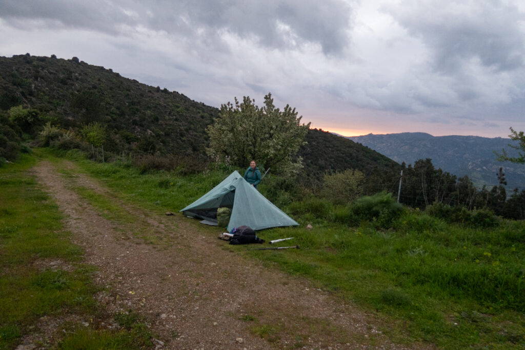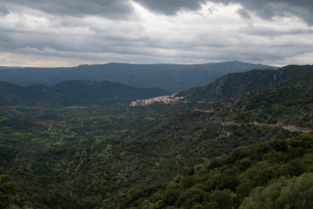 Blížime sa k sedlu Loddue, kde je križovatka ciest. Asi prvýkrát sa stalo, že Jozef potreboval lopatku skôr ako ja, idem teda napred. Počkám ho pri prameni, Funtana Loddue, a študujem mapu, kde by sme mohli spať. Pokračujeme po turistickej trase prudko dohora, aby sme prešli pár serpentín. Asfaltová cesta potom obchádza kopec a turistická ide cez, ale nevieme ju nájsť. Obávame sa v akom je stave, tak ideme radšej po normálnej ceste. Aspoň máme výhľady na mestečko Lodè.